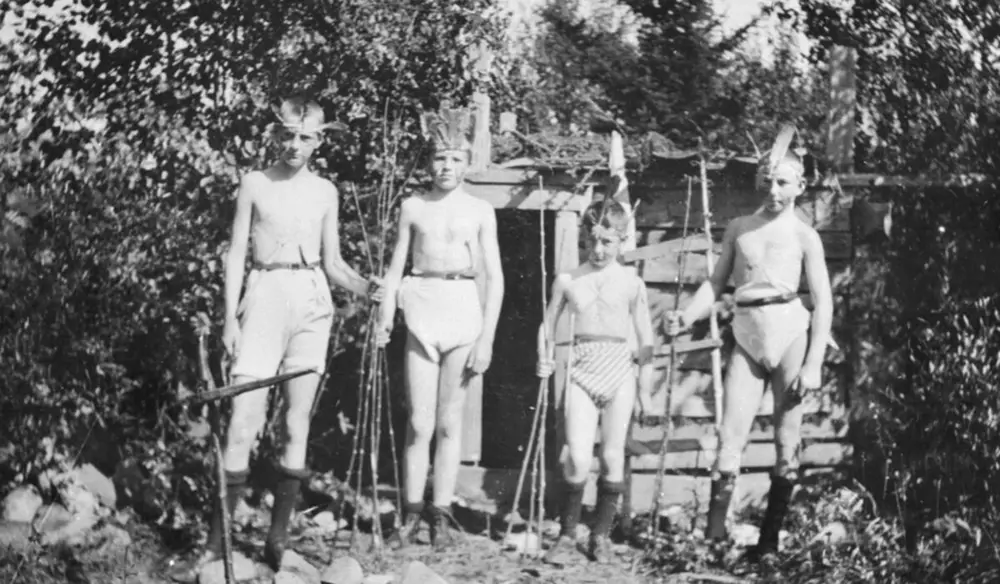 Gutter fra Hamar leker indianere på ferie i Mesnalia, Ringsaker, 1920-åra. Foto: K. Berger Christiansen/Anno Domkirkeodden. - 3/7