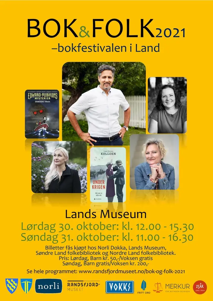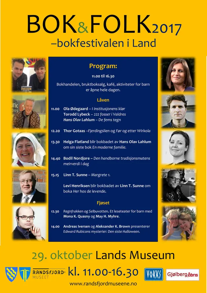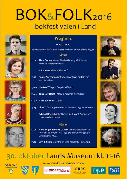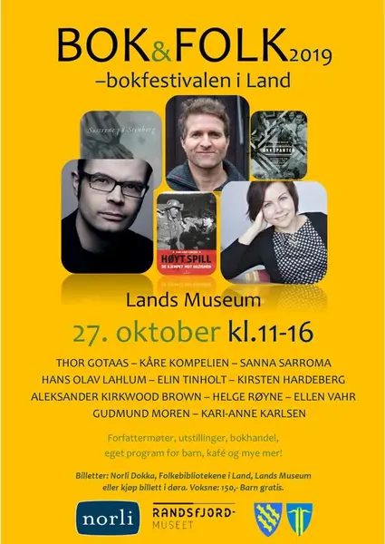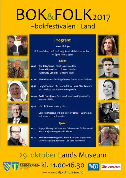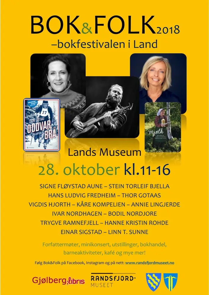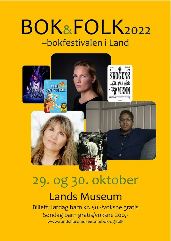 BOK&FOLK - bokfestivalen i Land hadde sin første arrangement i 2013 og har en fast tradisjon på museet den siste helgen i oktober. Når bladene på trærne ute begynner å bli gule er det på tide å gjøre museet klart for bokfestival. Vil du mimre tilbake så finner du alle plakater og programblad fra tidligere år her: