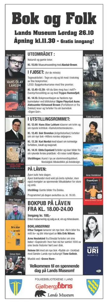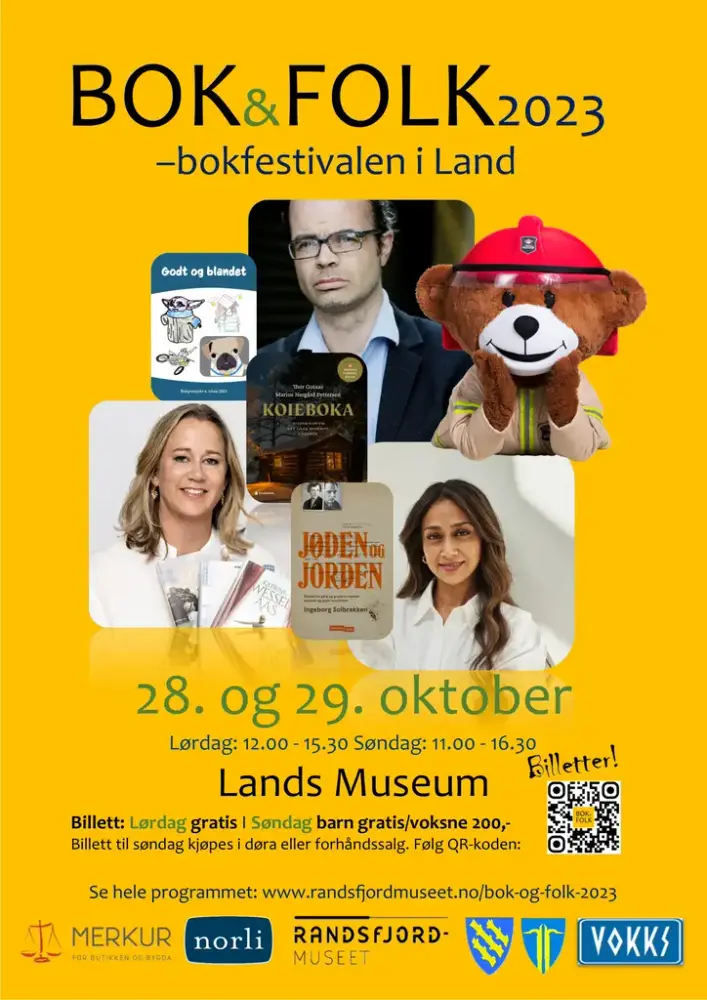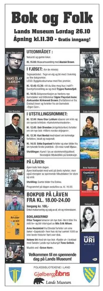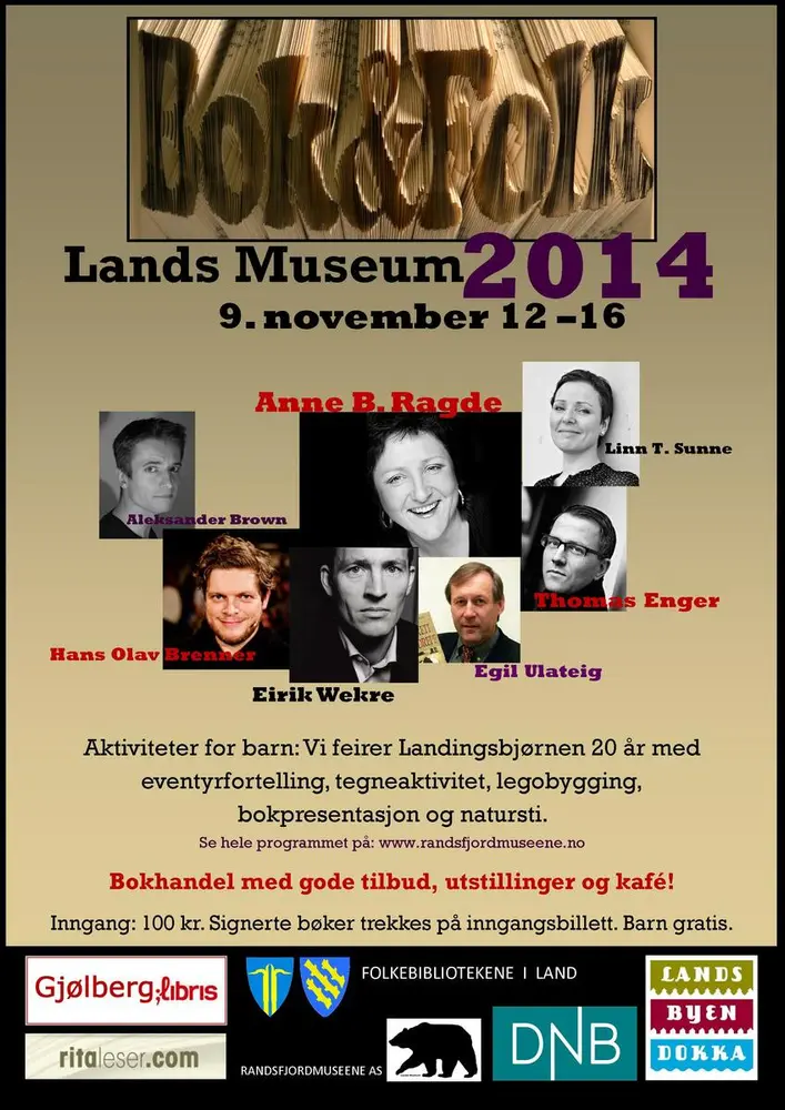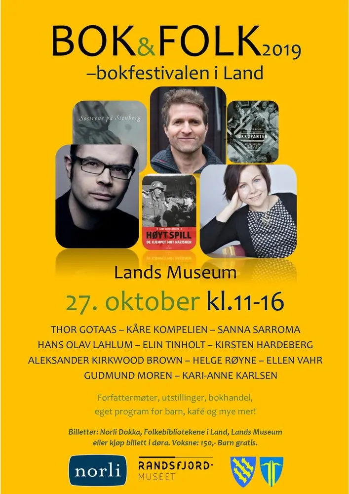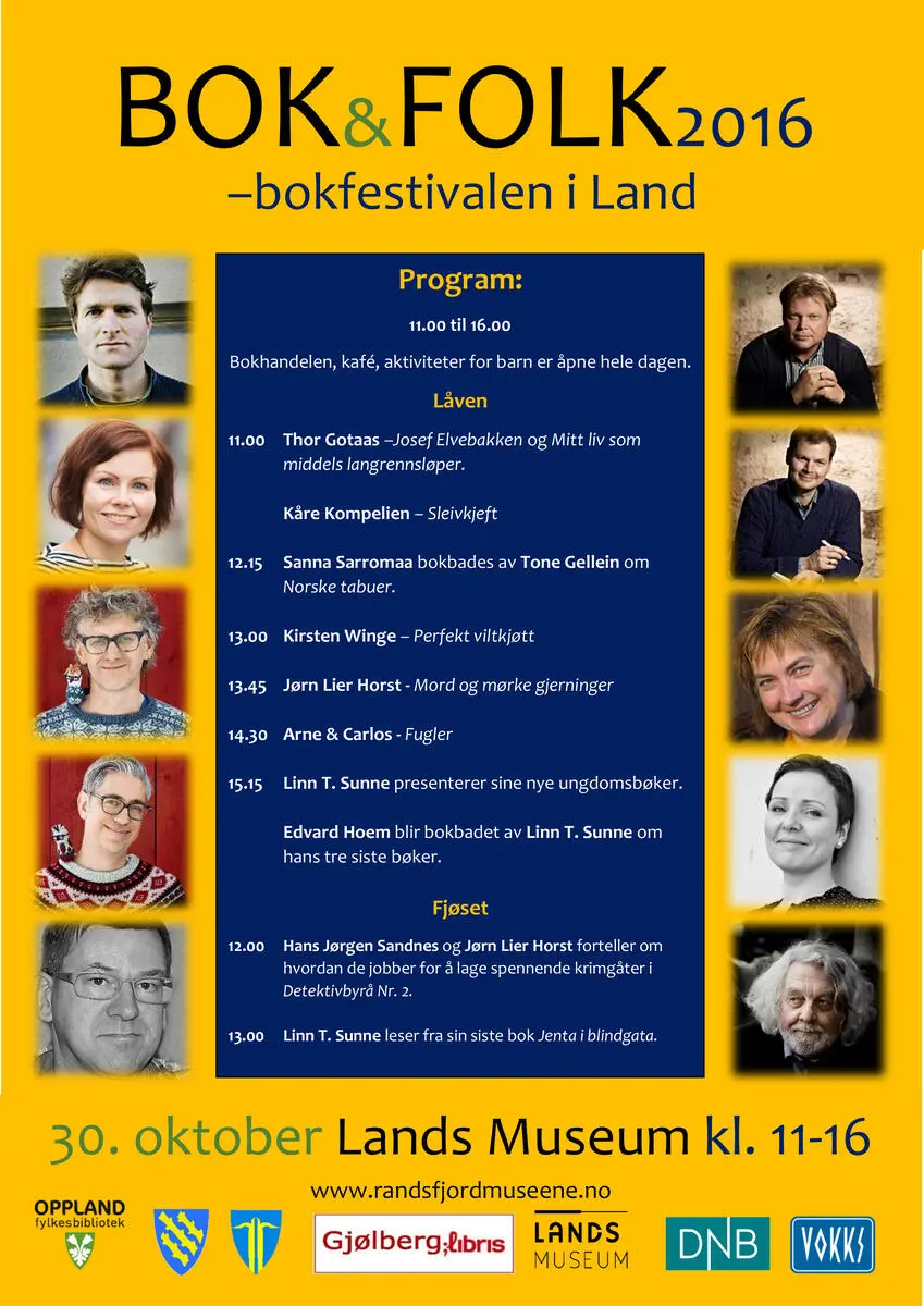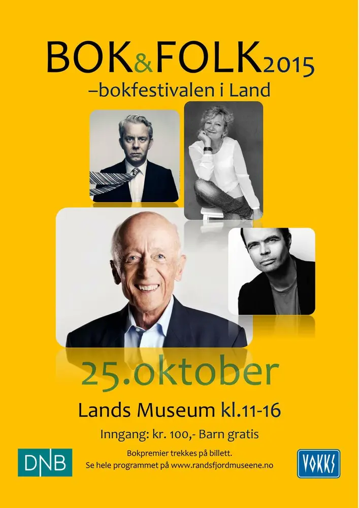 BOK&FOLK - bokfestivalen i Land hadde sin første arrangement i 2013 og har en fast tradisjon på museet den siste helgen i oktober. Når bladene på trærne ute begynner å bli gule er det på tide å gjøre museet klart for bokfestival. Vil du mimre tilbake så finner du alle plakater og programblad fra tidligere år her: