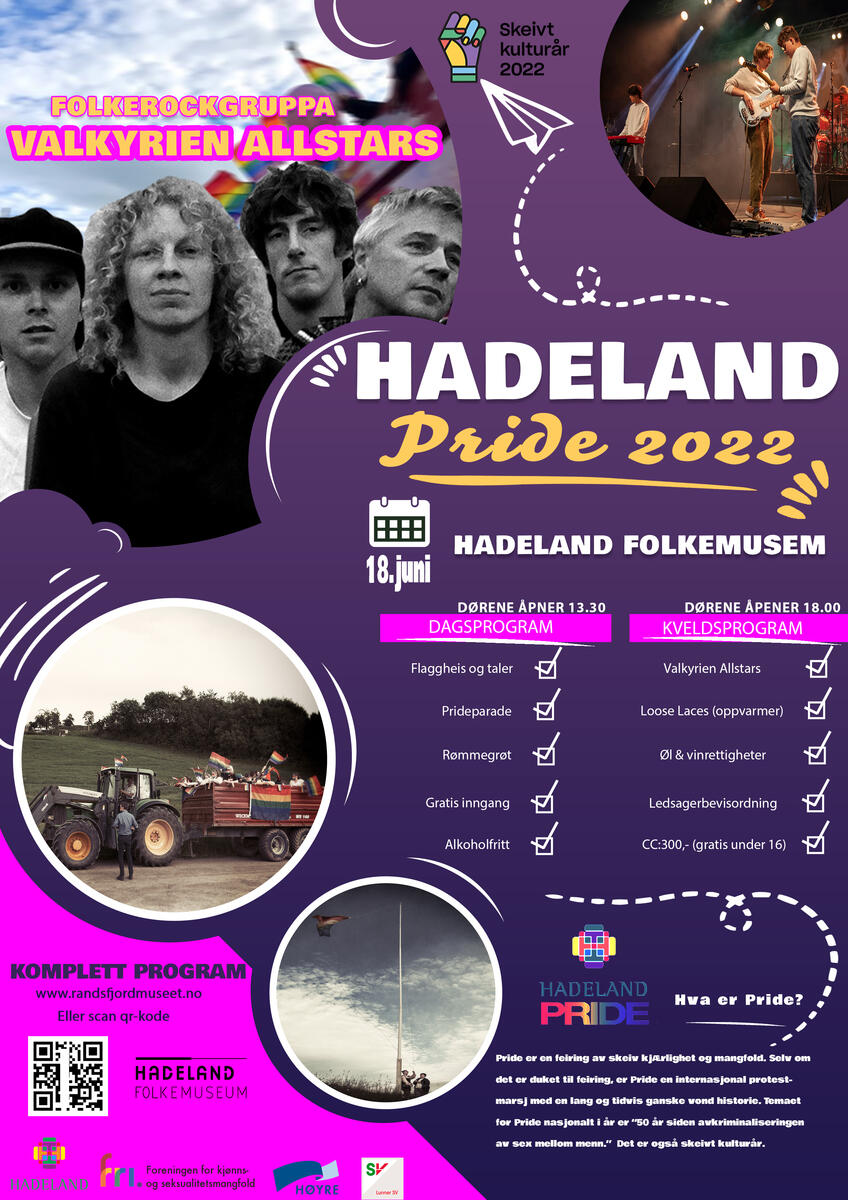 Programmet for årets Hadeland Pride bestod av flaggheising, appeller og kulturinnslag, samt traktorparade. Dessuten toppet vi det hele med et kveldsprogram hvor selveste Valkyrien Allstars holdt en fantastisk konsert. Lokalbandet Loose Laces varmet opp. Valkyrien Allstars er kjent som et av landets beste liveband, og har siden sin første utgivelse i 2007 gått foran i utviklingen av arrangert folkemusikk. Bandet har dratt i nye retninger for hver utgivelse det har sluppet, og har endt opp med et helt særegent uttrykk de ikke deler med noen.