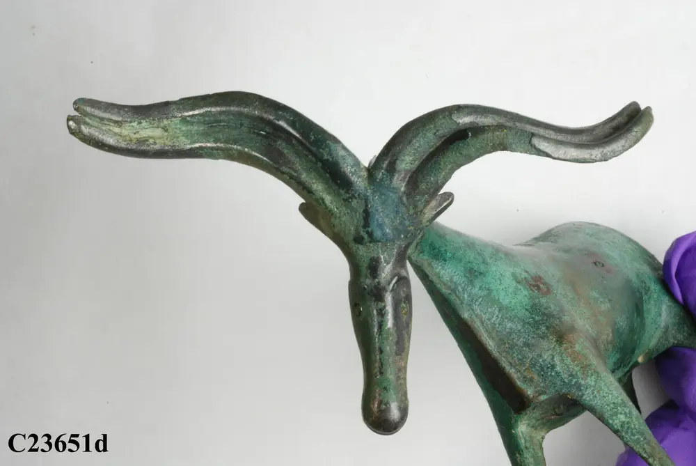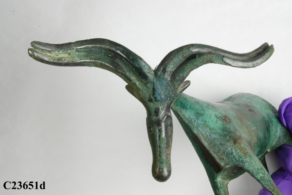 Bronsebukkene De to dyrefigurene er Vestbyfunnets mest spesielle gjenstander. Hodene og kroppene har vært støpt hver for seg, til ulik tid, og hodene var minst 200 år gamle da de ble lagt ned i jorda omkring 500 fvt. Hodene er tolket til å opprinnelig å ha vært hestehoder med horn, mens de på et senere tidspunkt har fått geitekropper. Hodene settes i sammenheng med bronsealderens mytologiske solhest. Det er flere arkeologiske funn som bekrefter at denne skandinaviske solmyten var levende på Hadeland i bronsealderen.