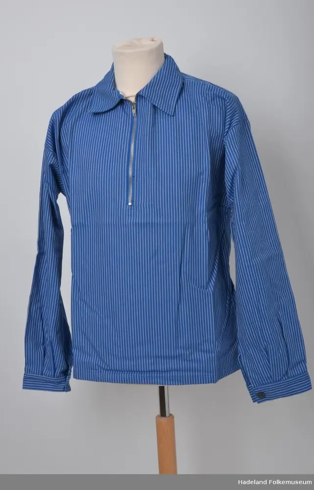 Hadelandsbusserull: Busserull, mannsplagg, arbeidsplagg. Kypertvevet bomullstoff fra Solberg Spinderi, stripet blått/hvitt med smale svarte striper. Skrått, isydd skulderstykke. Søm tvers over kile under ermene. Krage. Mrk. Berserk str.50. Konfeksjon.