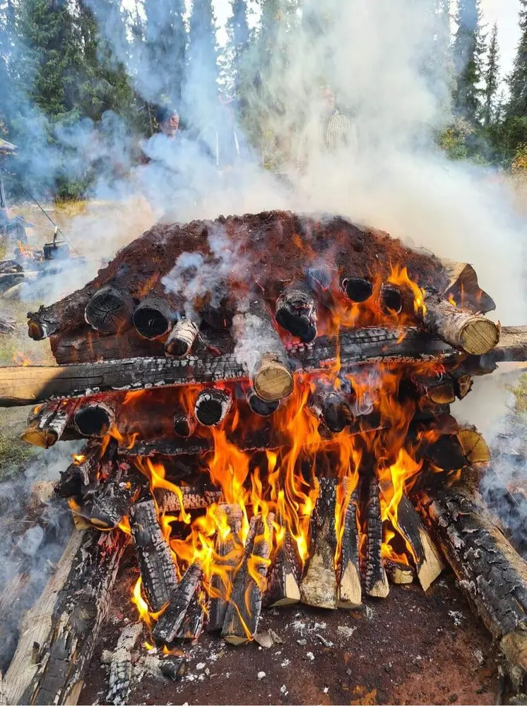 Fredag 09.09: Vi røster myrmalmen over stort bål ved vår rekonstruerte jernvinneanlegg fra middelalderen. Blesterplassen i kulturstien.