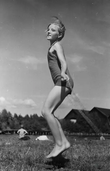 Jente som hopper tau i sommervarmen, 1938. Foto: B. Bjerke/Mjøsmuseet.