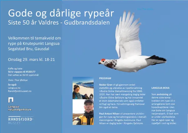 Reidar Gran vil gå gjennom enkel statistikk og utøvelse av rypeforvaltning i Øystre Slidre Statsallmenning fra 1968-2020. Han har vært mangeårig daglig leder i Øystre Slidre fjellstyre og har innsamlet et stort datamateriale som også omfatter orrfugl og hare. Forvaltningsvalg framover blir også et tema.