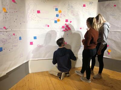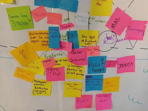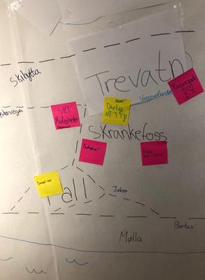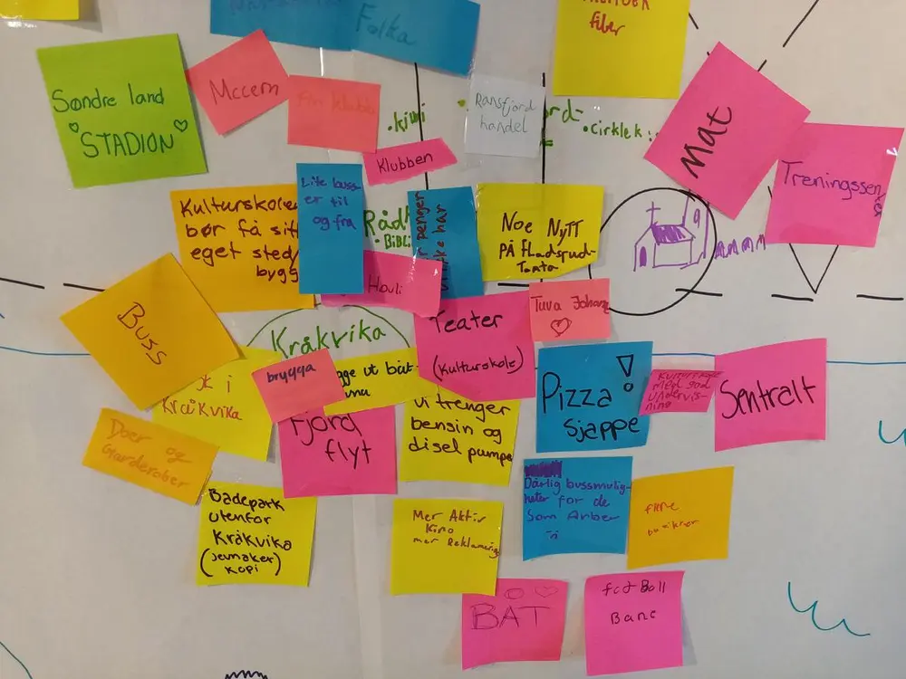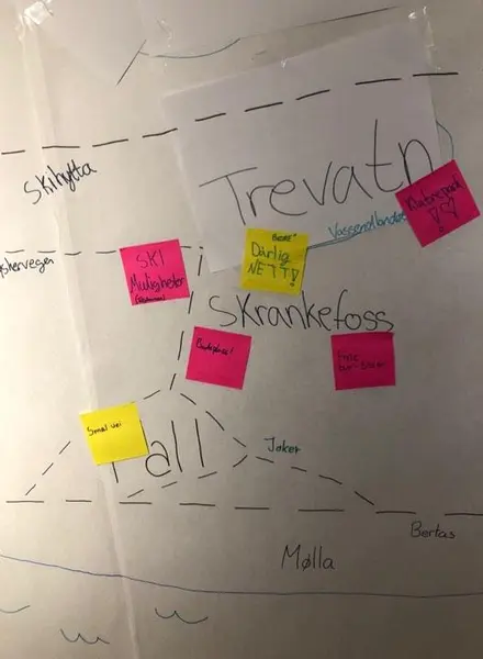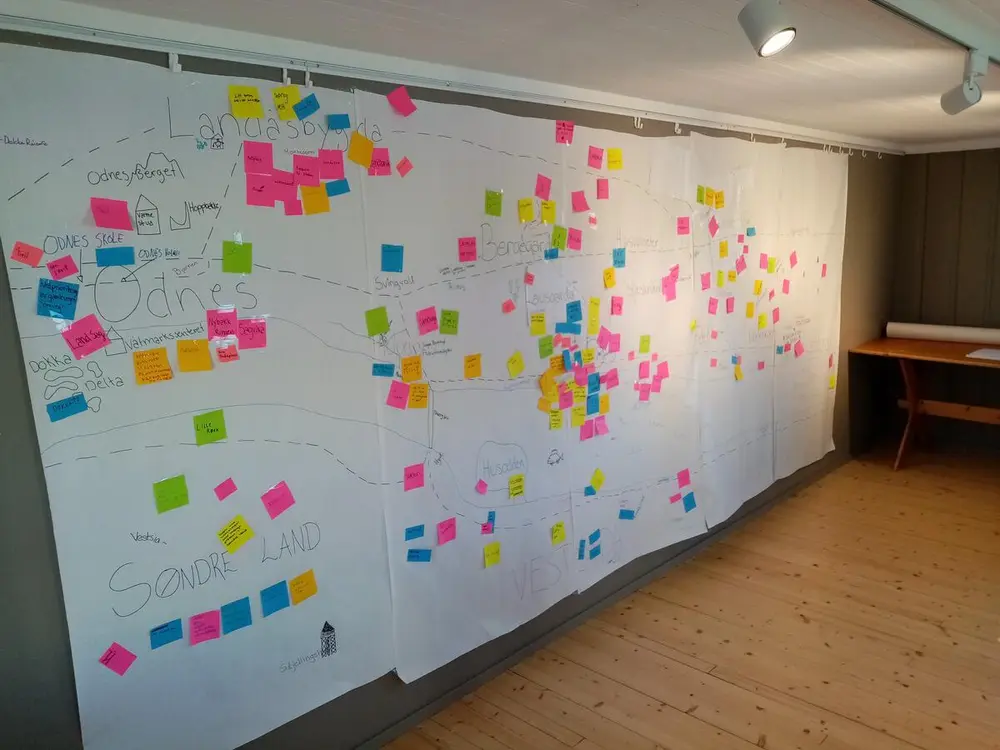 Ungdomsrådene i Søndre og Nordre Land lagde jo i 2019 hvert sitt store kart over kommunene sine. De brukte post-it-lapper for å uttrykke følelser og komme med meninger og forslag til forbedringer i kommunen.