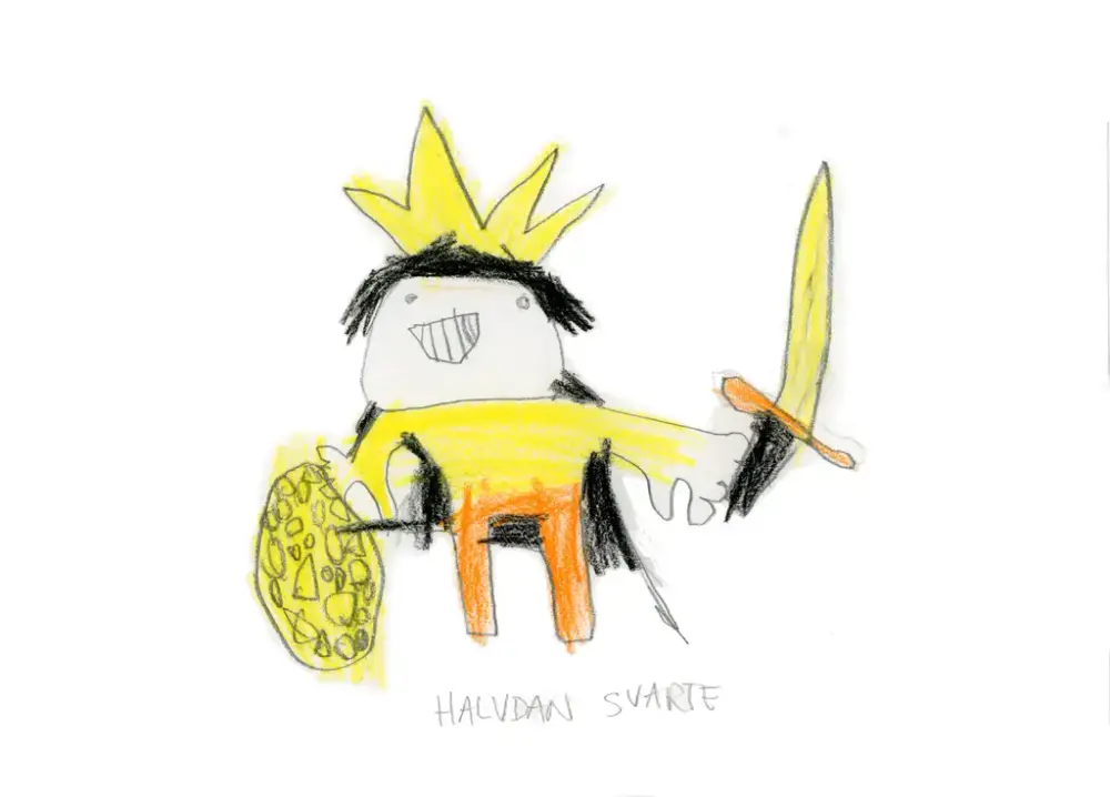 Samtidig stiller vi ut barns egne tegninger av Halvdan Svartes død.